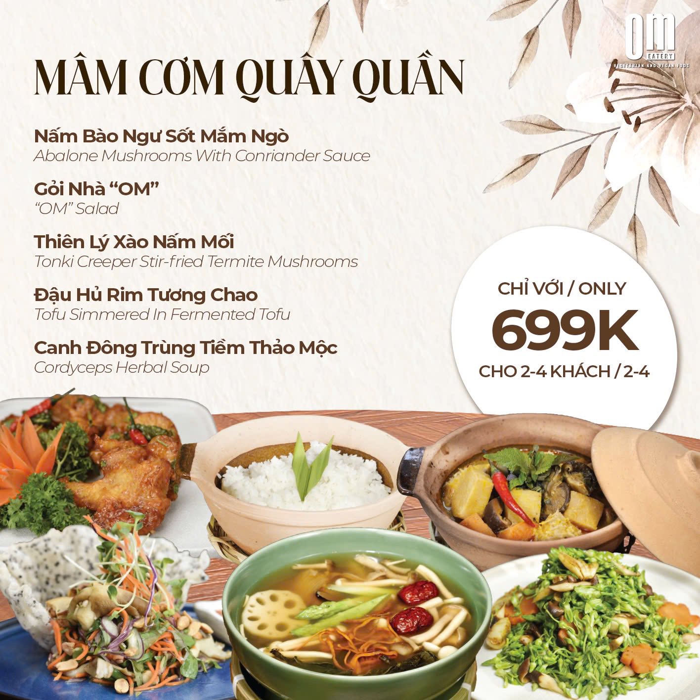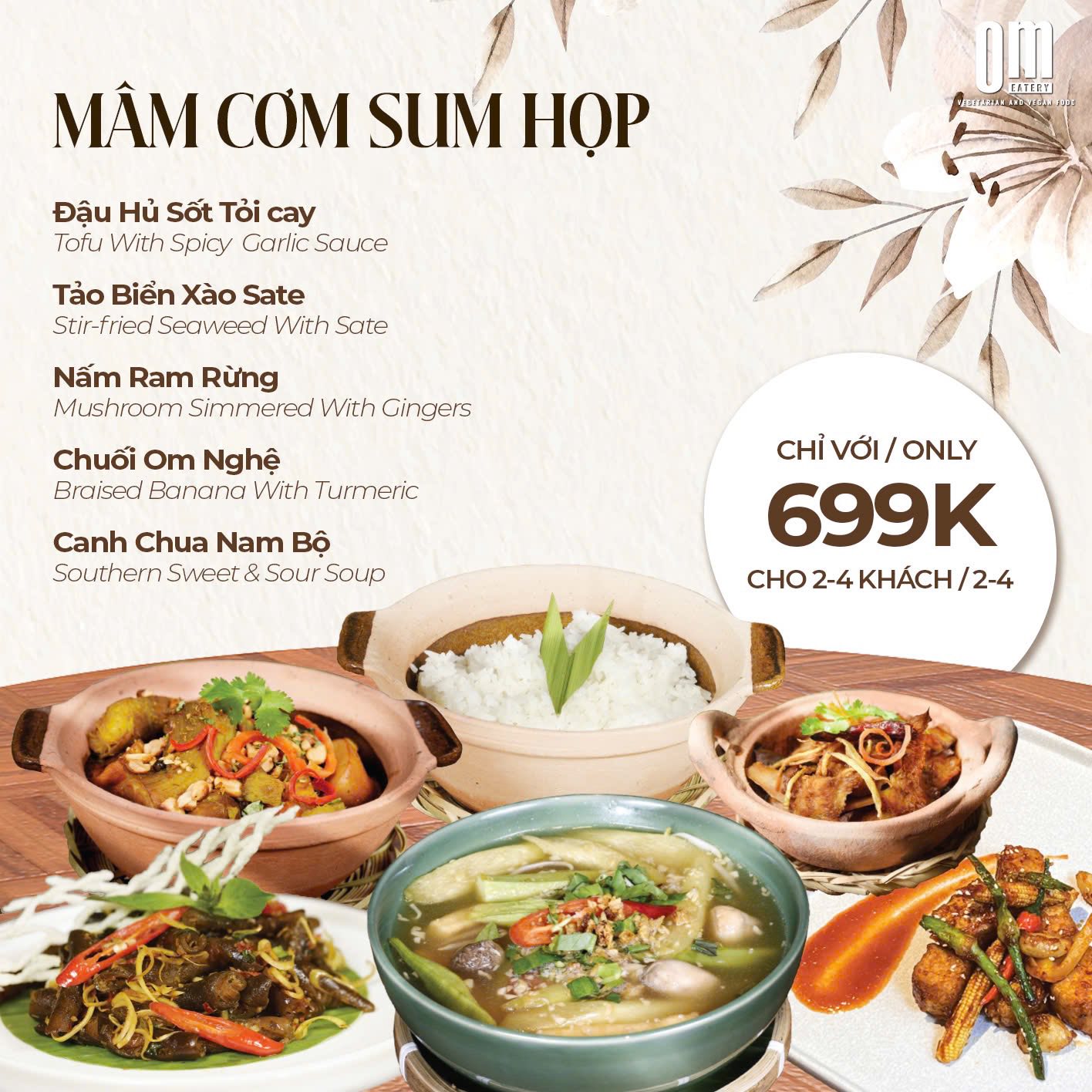 Tại OM Eatery, chúng tôi trân trọng mời quý thực khách dừng chân giữa trưa, chọn cho mình một mâm cơm chay ấm cúng – Quây Quần hoặc Sum Họp – được bày biện chỉn chu, đậm chất truyền thống và ngập tràn yêu thương.