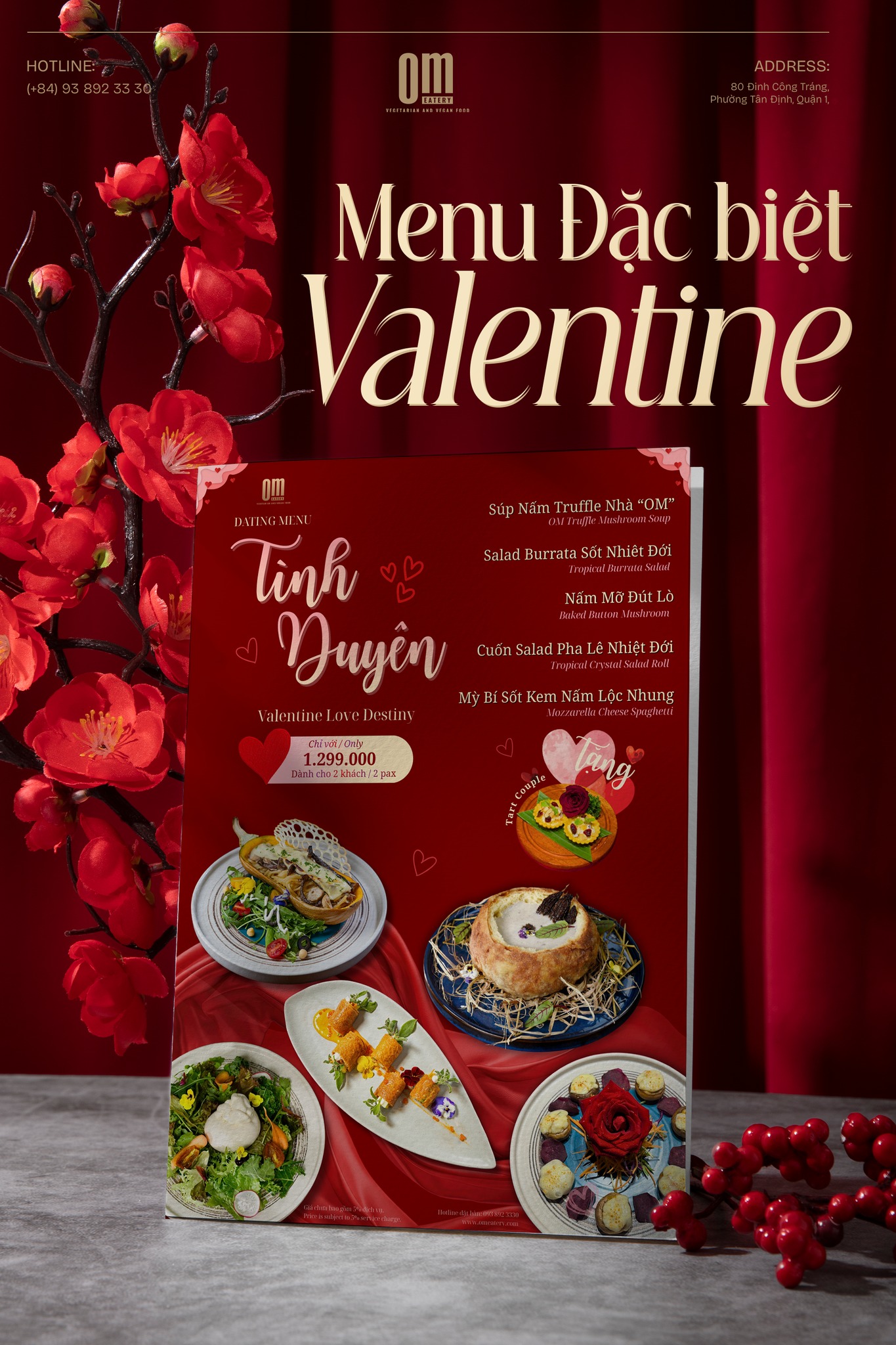Thấu hiểu giá trị của những cuộc gặp gỡ chân thành ấy, nhà hàng chay OM Eatery mong muốn mang đến một trải nghiệm Valentine trọn vẹn – nơi bữa ăn không chỉ là hương vị, mà còn là cảm xúc được nuôi dưỡng qua từng chi tiết nhỏ. Từ những món chay tinh tế, không gian ấm áp được chăm chút nhẹ nhàng, đến nhịp điệu yên bình giúp hai người thật sự hiện diện bên nhau, tất cả được chuẩn bị như một lời tôn vinh tình yêu – sâu lắng, riêng tư và đủ tinh tế để mỗi buổi hẹn trở thành một kỷ niệm đáng nhớ.